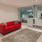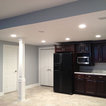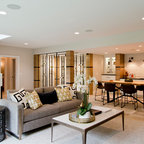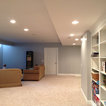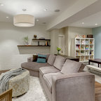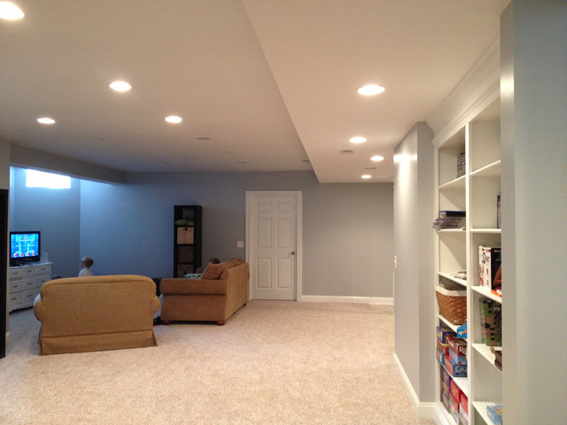 Basement - mid-sized traditional underground carpeted basement idea in Cleveland with gray walls —  Houzz