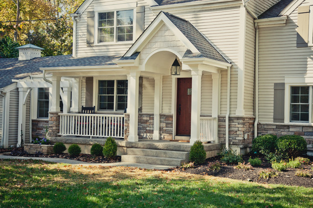 Mid-sized classic concrete front porch idea in Cincinnati with a roof extension — Houzz