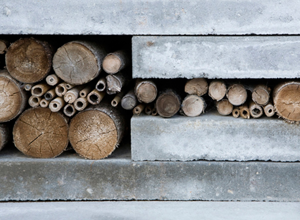 At the same time the garden makes use of affordable, simple, no-nonsense materials. The 40x60 cm paving stones are one of the most common and affordable paving options in the Netherlands, available en masse for free on the Internet. Conceptually we imagined a garden completely paved with the tiles (as to many gardens are) and what would happen if took out some of these stones, used them to build benches and structure and added plants where the tiles had been. In the construction of the benches we include other materials such as bamboo sticks and insulation bricks that create habitat for insects such as solitary bees.
