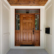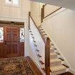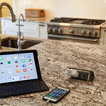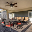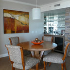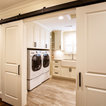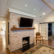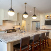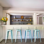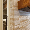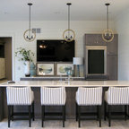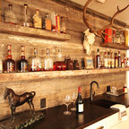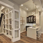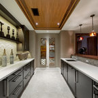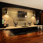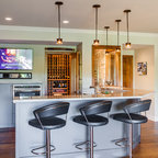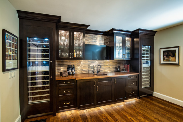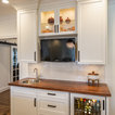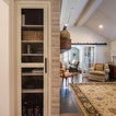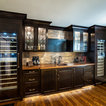 This exquisite pub features a brushed copper metal tile that perfectly complements the Napoli round self rimming antique copper bar sink by Thompson Traders. The bar, designed by Michaelson Homes and crafted by Riverside Custom Cabinetry, includes seeded glass in the upper cabinets, a walnut countertop, and two 24" Thermador Build in Wine Preservation Columns, each with custom paneling to seamlessly fit with the other cabinets. Lighting in and under the upper cabinets, as well as under the base cabinets, adds an extra touch of style and warmth to the space.