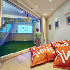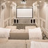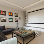 Home theater - traditional enclosed carpeted and black floor home theater idea in Salt Lake City with beige walls and a projector screen — Houzz