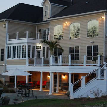 Example of a large classic backyard deck design in DC Metro with a roof extension