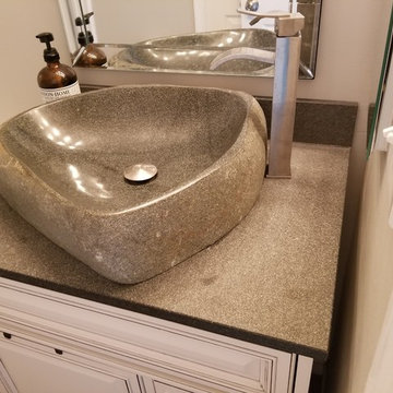 Bathroom - small transitional gray tile and glass tile bathroom idea in Denver with raised-panel cabinets, white cabinets, a two-piece toilet, white walls, a vessel sink and quartz countertops
