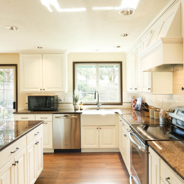 Example of a classic medium tone wood floor open concept kitchen design in Other with a farmhouse sink, recessed-panel cabinets, white cabinets, granite countertops, white backsplash, ceramic backsplash, stainless steel appliances and an island