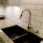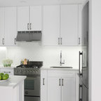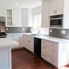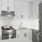 Small transitional l-shaped porcelain floor enclosed kitchen photo in New York with an undermount sink, white cabinets, quartz countertops, white backsplash, subway tile backsplash, stainless steel appliances, shaker cabinets and a peninsula — Houzz