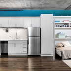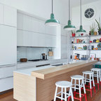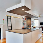 You will notice that many of the spaces featured in this article have dropped ceiling panels over the kitchen to allow for new overhead elements to be installed. This can be helpful when looking to add new lighting (especially recessed pot lights) or make any other ceiling-related changes such as rerouting your ventilation or using a new hood fan.Depending on the fixtures you want to add, this can require a 6- to 12-inch drop. It’ll be a noticeable change in ceiling height but only in a small area and usually not so much that you’ll be hitting your head.