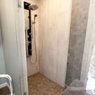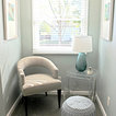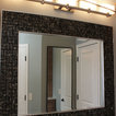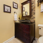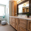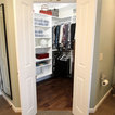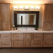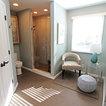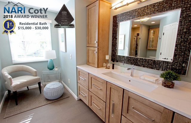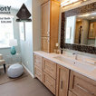 The challenge of this master bath was to create a luxurious transitional style bathroom that offered the client a shower spa, functional storage, while updating the appearance to embrace an aesthetically pleasing pallet. The area where the soaker tub sat was transformed into a small sitting area that is practical and an innovative use of the space. The overall design of this space maximizes storage in both the vanity and closet areas, enhancing the overall function and versatility that provides the client a place for everything. The client is very pleased with the excellent detailed workmanship and is very satisfied with the result of the project. The products installed are Medallion Cherry cabinets with Cappuccino stain, a tiled framed mirror, decorative hardware from Top Knobs. On the countertop is Silestone quartz with Amelia porcelain tile installed in the shower. Rubbermaid closet system was installed for organization.