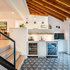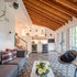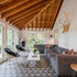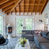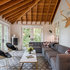 Large gray sectional paired with marble coffee table. Gold wire chairs with a corner fireplace. The ceiling is exposed wood beams and vaults towards the rest of the home. Four pairs of french doors offer lake views on two sides of the house.