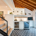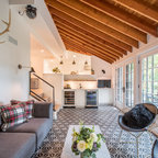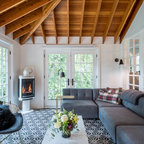 After: Clean white paint and dramatic floor tile refresh the look, while new midcentury-inspired furniture provides ample seating for the family and their guests. The sofa’s placement against the room’s back wall takes advantage of the views out the French doors.