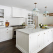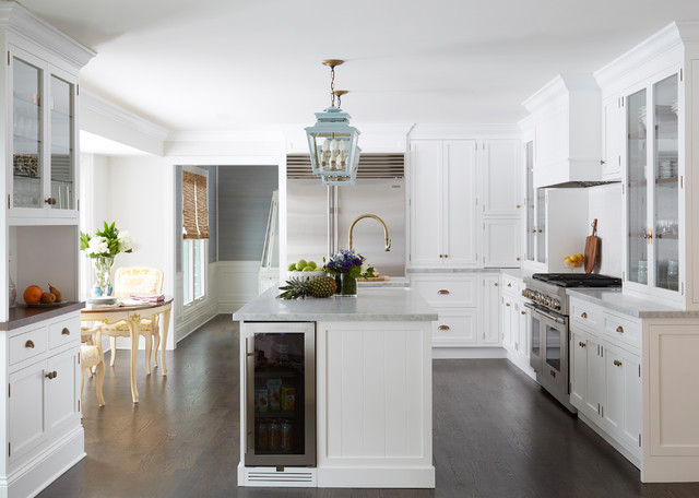 Transitional dark wood floor kitchen photo in Chicago with a farmhouse sink, shaker cabinets, white cabinets, marble countertops, white backsplash, subway tile backsplash, stainless steel appliances, an island and gray countertops — Houzz