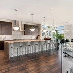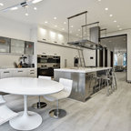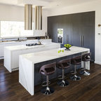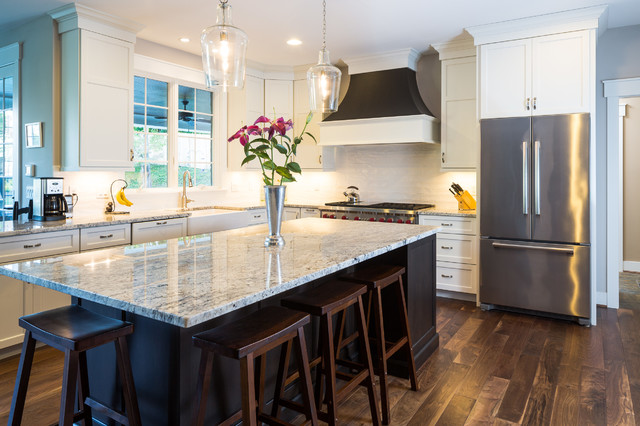Inspiration for a large modern dark wood floor eat-in kitchen remodel in Cincinnati with a farmhouse sink, flat-panel cabinets, white cabinets, granite countertops, white backsplash, ceramic backsplash, stainless steel appliances and an island — Houzz