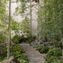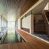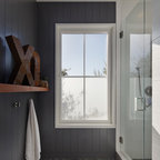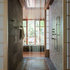 2. This walk-through shower designed by CTA Architects Engineers features a slate floor with inset wood slats that lead to a drain underneath.