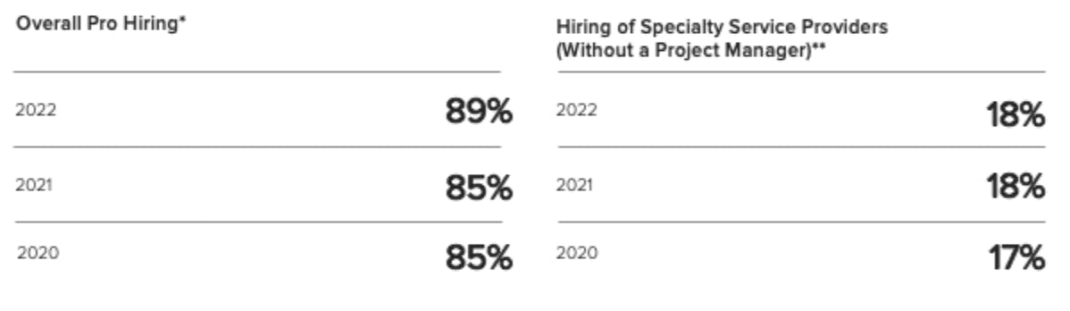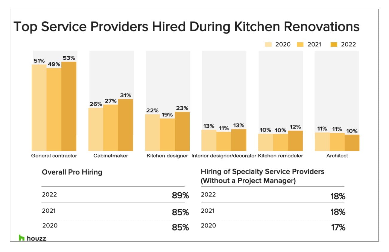 Given the flurry of DIY-unfriendly remodeling projects, it follows that pros are being hired in droves. “In fact, hiring rates for home professionals to complete these projects are the highest we’ve seen in four years,” Sargsyan says. A whopping 89% of homeowners bring on pro help, up by 4%. General contractors are the most sought after, with 53% of renovators hiring them — also up by 4%. Cabinetmakers, kitchen designers, interior designers and kitchen remodelers also have been seeing higher demand this year.
