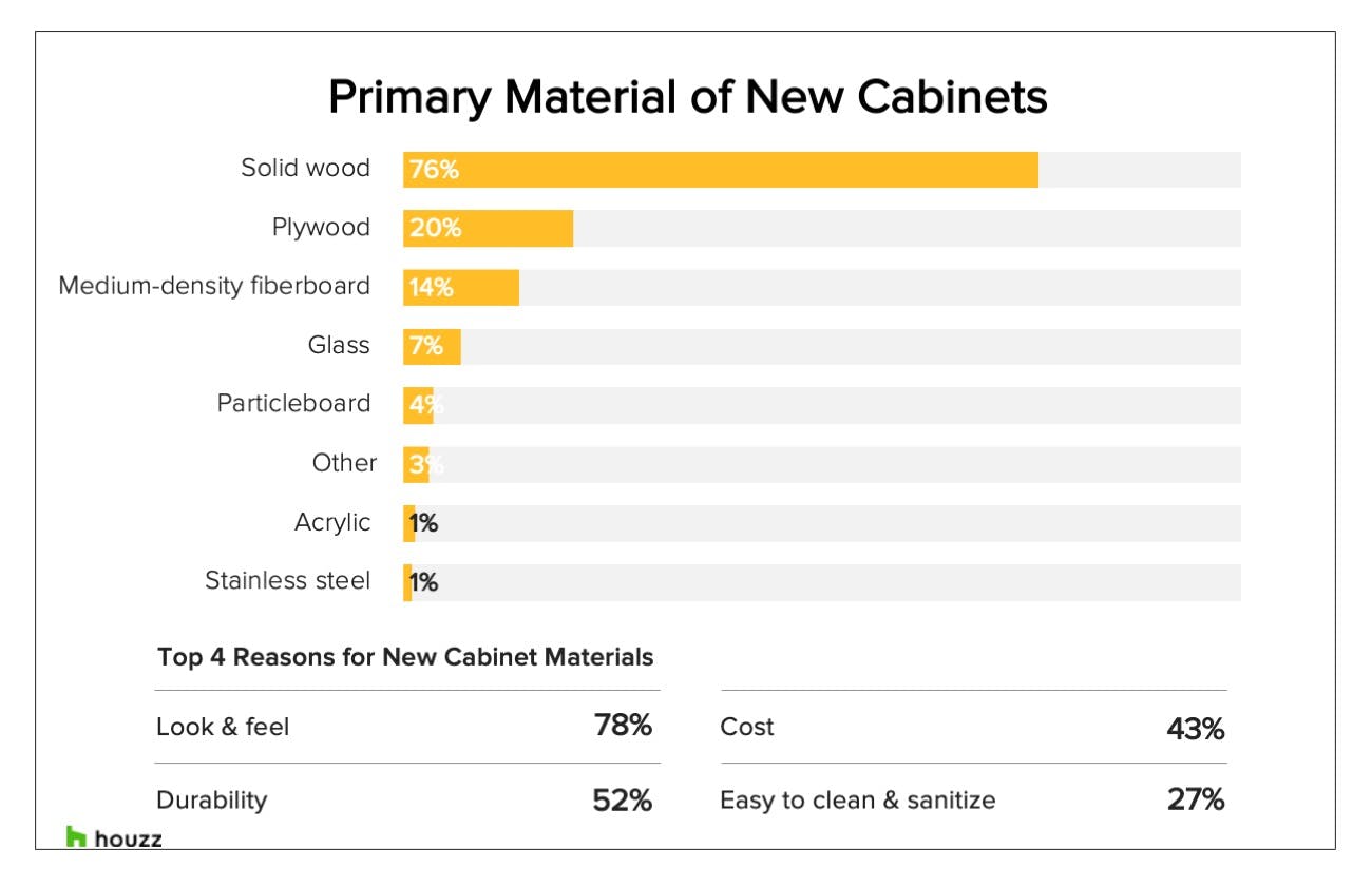 Wood reigns supreme among new cabinet materials, with 76% of renovators going with solid wood and 20% opting for plywood. The least popular choices? Acrylic and stainless steel.