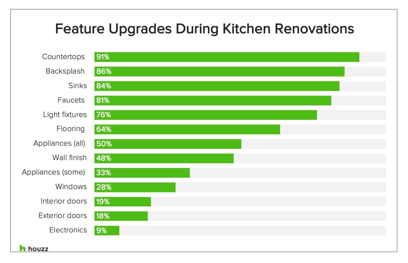 Countertops are at the top of the upgrades list, with 91% of homeowners revamping them. Backsplashes aren’t far behind, at 86%, and sinks are being swapped out by 84%. Kitchen electronics haven’t quite caught on yet, with only 9% of homeowners upgrading them.