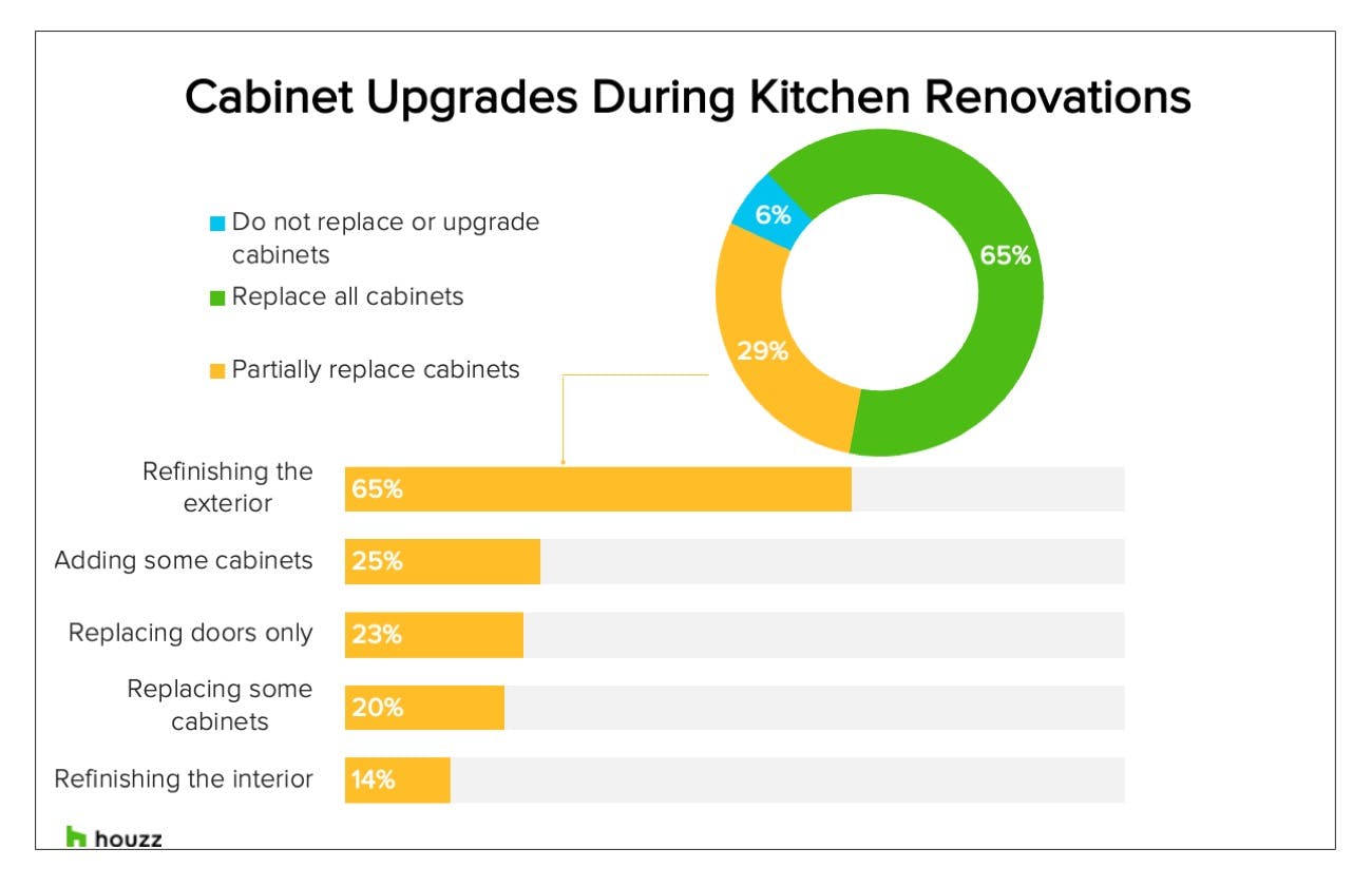 Cabinets comprise their own category, with 94% of renovators either fully or partially replacing them. When the cabinets aren’t totally swapped out, refinishing is the upgrade of choice. A quarter of homeowners also add some cabinets.