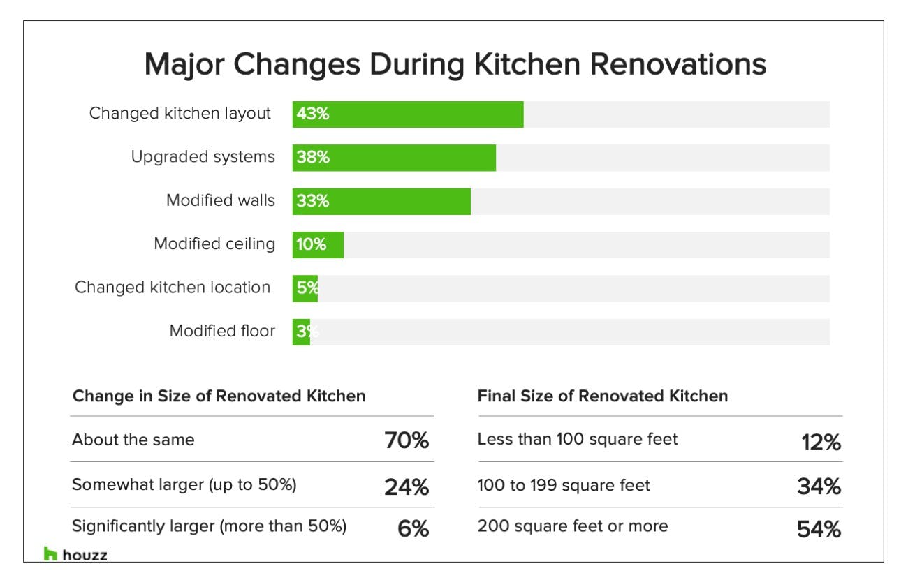 Homeowners aren’t skimping on the range of renewed features, either. A substantial 43% change the layout, 38% upgrade systems, and more than a third modify walls. While kitchen sizes aren’t changing much, 5% of homeowners switch the location.