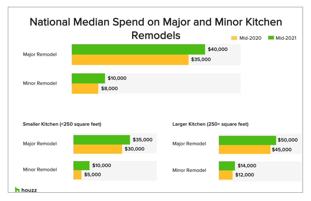 Homeowners dropped more dollars on both major and minor kitchen remodels than during the same period a year earlier. The median spend on major remodels, meaning at least all-new cabinets and appliances, grew by 14%, to $40,000. Minor remodels saw an even bigger budget boost, rising by 25%, to $10,000. And size doesn’t matter here: For kitchens both larger and smaller than 250 feet, the median spend increased by $5,000.