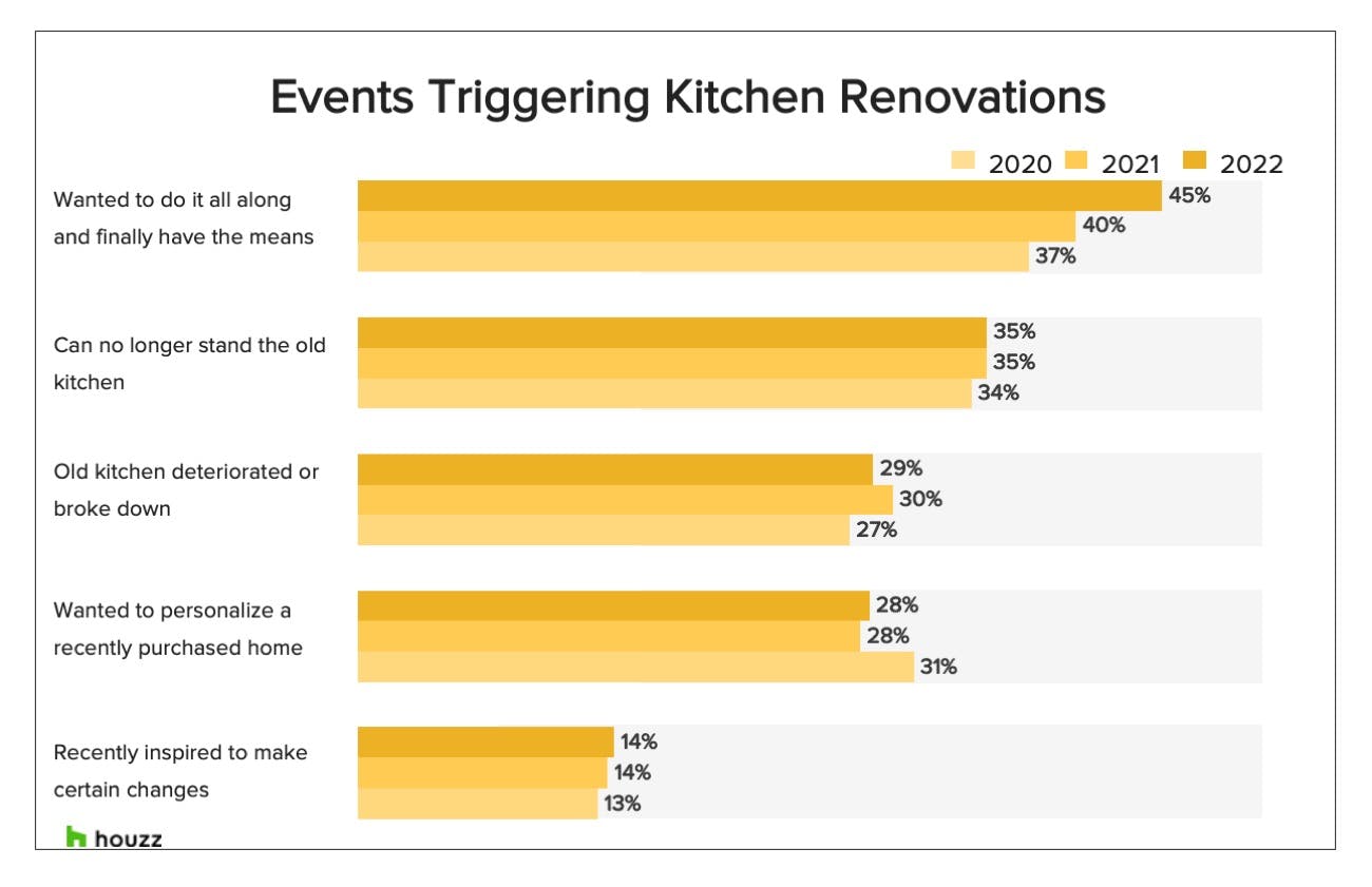 The reasons for this spate of bringing kitchens up to date? More than a third of renovators say their impetus was that they could no longer stand the old kitchen. (Working from home at a crowded kitchen table in a dysfunctional space, anyone?) And 45% report they’d been wanting to renovate all along and finally had the means. That percentage is up by 5 points this year.
