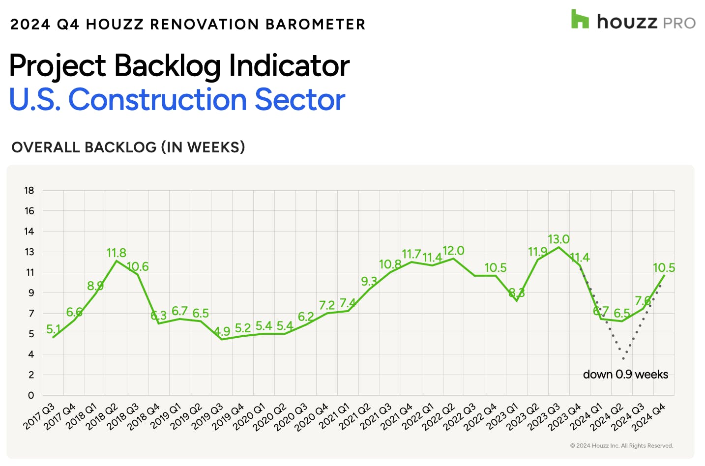 Every quarter, we share insights from the Houzz Renovation Barometer to help you stay abreast of industry trends and make better business decisions. The Barometer provides insights on business expectations, project backlogs and recent activity among businesses in the U.S. construction and architectural and design services sectors, related to residential projects. Here are the findings for the fourth quarter of 2024, including data based on Q3 2024 results, specifically for two groups of construction professionals: design-build firms and build-only firms.