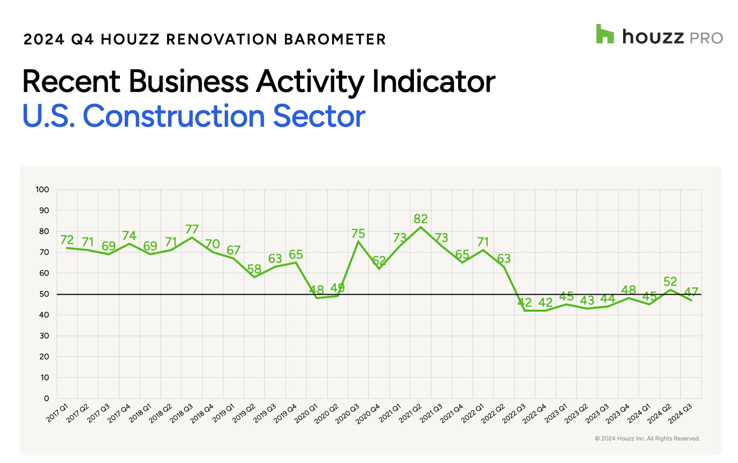“Business activity slowed in Q3, especially in the construction sector, with fewer project inquiries and commitments compared with Q2,” Houzz staff economist Marine Sargsyan says. “However, the outlook for Q4 remains positive.”