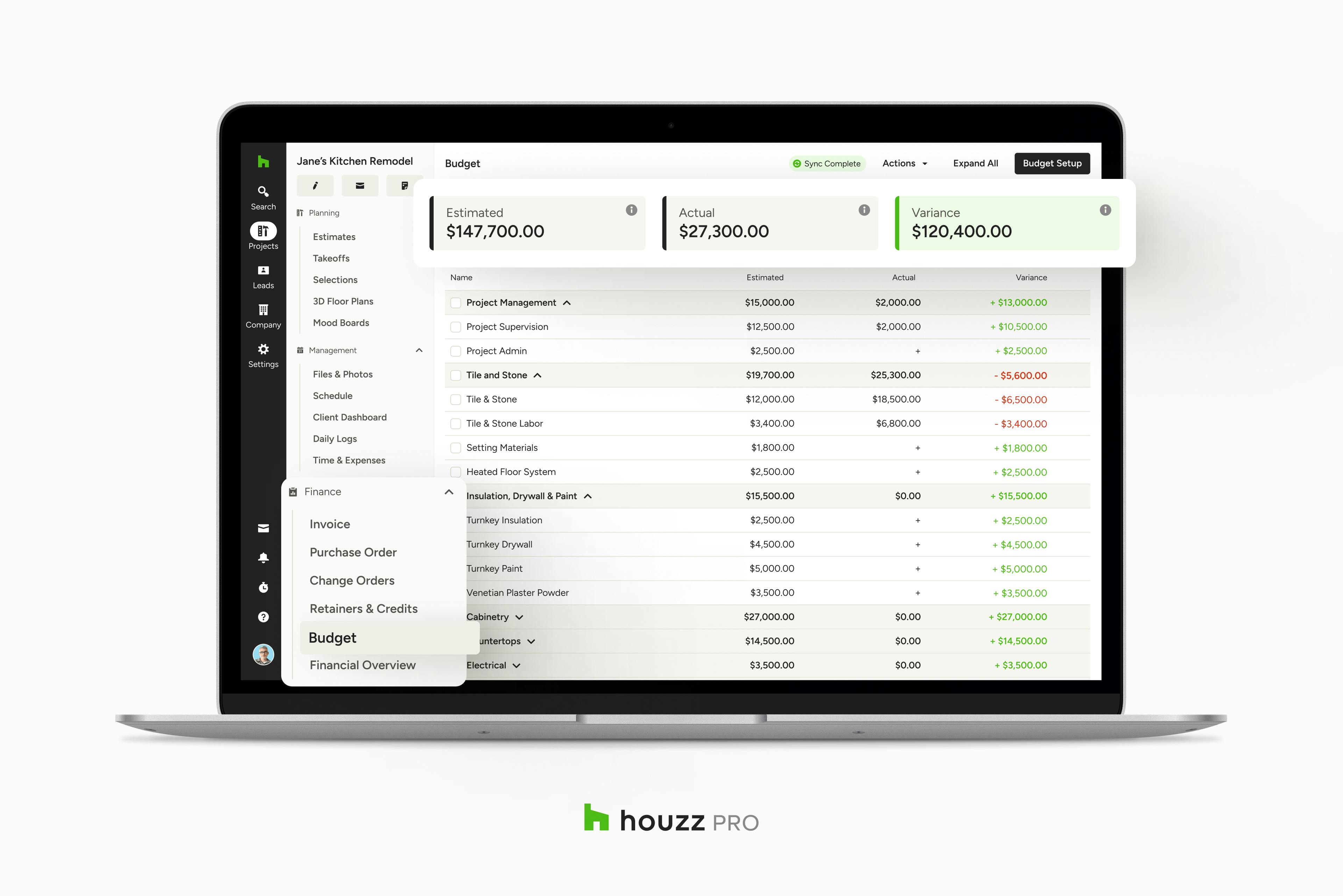 The Budget feature lets you compare estimated versus actual costs for a project in real time. It pulls all the estimated costs, actual costs and expenses you track in Houzz Pro into one view, enabling you to quickly assess overall project profitability as well as understand specifically where a project is over or under budget. And when you have a detailed view of estimated versus actual costs, you can build more accurate estimates on future projects. On a cost-plus project, you can choose to share the budget with your clients.