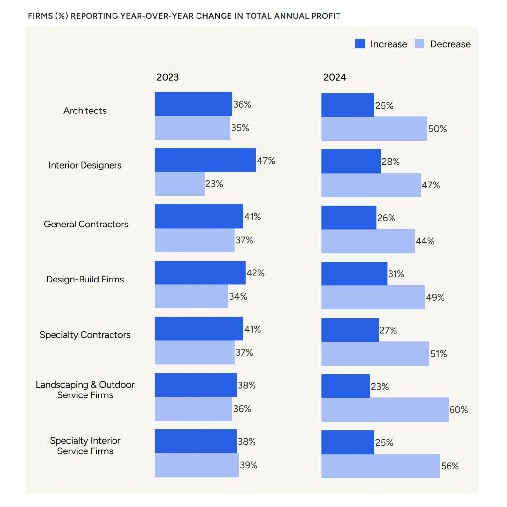 Across all seven industry groups we surveyed,* more firms reported an annual profit decrease in 2024 than in 2023 (44% to 60% versus 23% to 39%). It was the biggest year-over-year dip in average annual revenue since 2014.