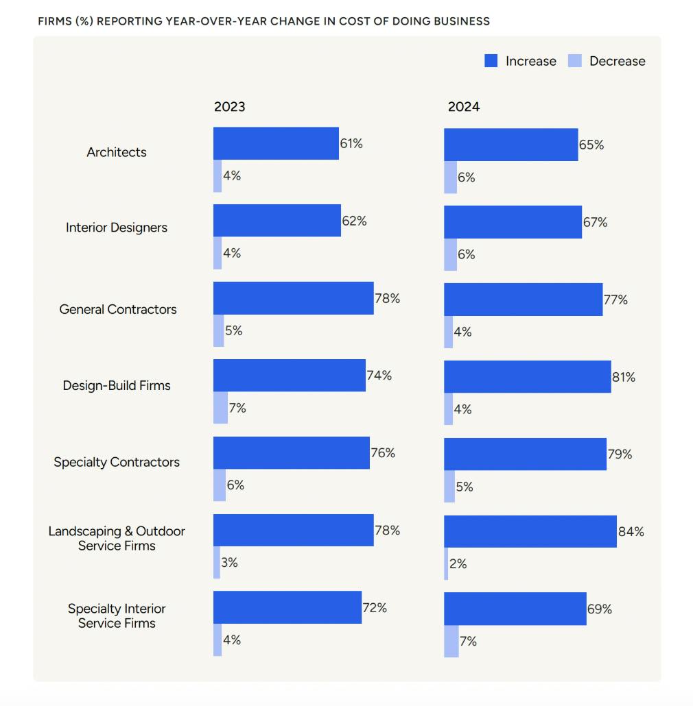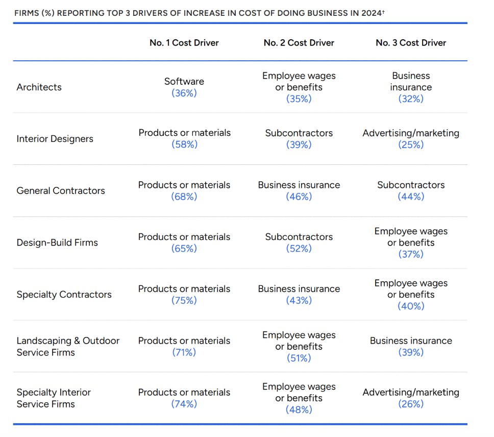 For six of the seven industry groups, rising product and material prices contributed most strongly to the increase in their cost of doing business in 2024. Architects were the exception. For them, the top three cost drivers were software (36%), employee wages or benefits (35%), and business insurance (32%).