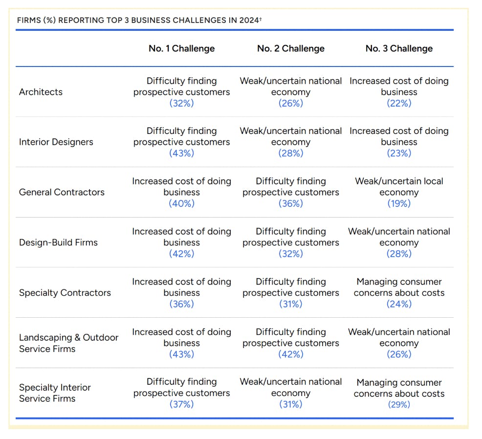 Many cited the weak or uncertain national economy and difficulty finding prospective customers as well. Design-build firms and specialty contractors were the only two groups that listed managing client concerns about costs among their top three challenges.