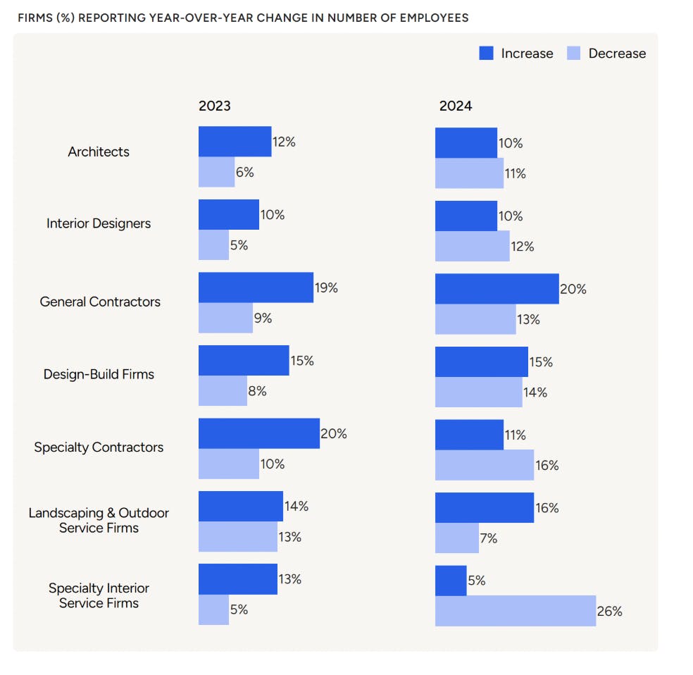 The majority of businesses across all seven industry groups reported no change in their number of employees in 2024. Among firms that did experience change, speciality interior service firms saw the most widespread decline in employee numbers, with 26% citing it, and architects saw the most broad increase in employee numbers, with 20% citing it.