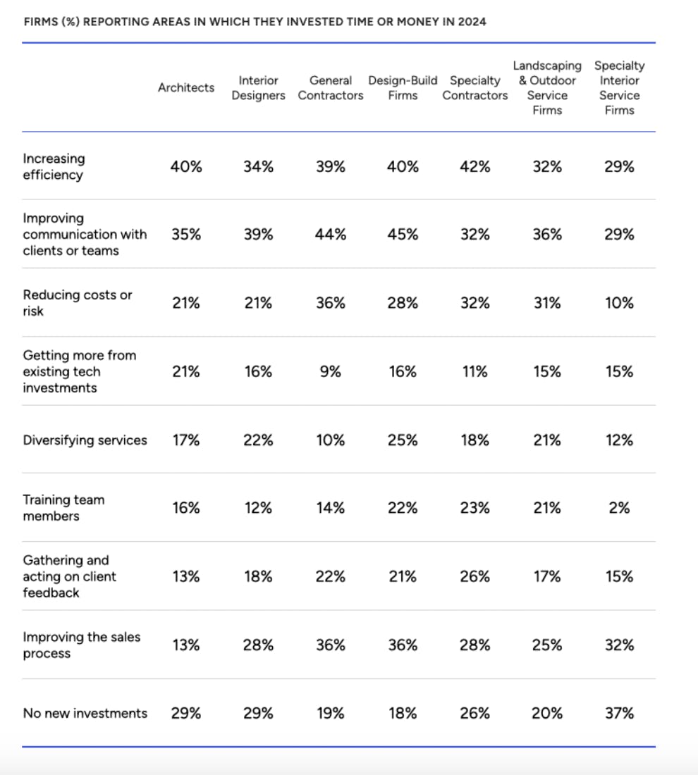 Dovetailing with the relative lack of change in staff headcount, many firms invested time or money in increasing efficiency among their employees and systems. This was the top investment focus for speciality service contractors (42%) architects (40%) and design-build firms (40%).