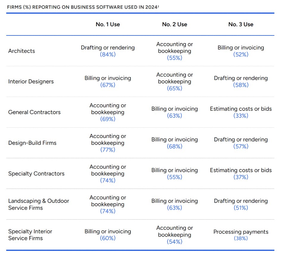 For 6 of the 7 industry groups, the top use for specialized software is either accounting/bookkeeping or billing/invoicing. Architects are the exception, with 84% naming drafting/rendering as their top software use. More than half of interior design firms (58%) and landscaping and outdoor service firms (51%) also use rendering software.