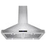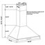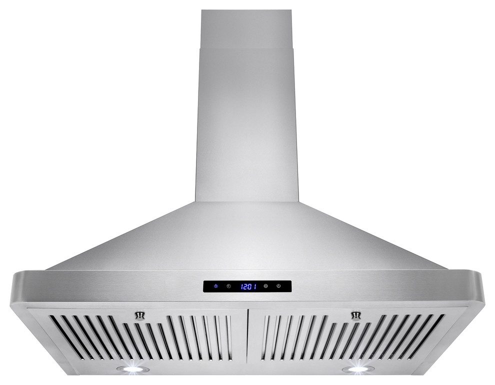 30" wide installed Dimensions: 29.5" X 19.75" x 42.25" 6" in diameter vertical duct/pipe 343 CFM Noise Level less than 65DB for ultra quiet operation Easy Installation, all parts and accessories included Adjustable telescopic chimney fits 8-9' ceilings Features stainless steel baffle filters - dishwasher-friendly, easy to remove 3 years parts warranty 2 x 2W LED lights Motor power: 194W Airflow Efficiency: 1.77 Speed settings: 3-speed touch control Range hood venting type: Updraft Clearance, above cook top: 28"-35" Power rating: 120V 60HZ ETL safety approval within US and Canada Ductless installation available with additional carbon/charcoal filters page_type: page_view_product product_topic: topic_12517 product_price: price_level_3