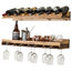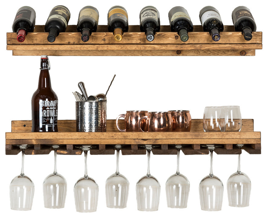 This is for a set of 2 shelves. We use high grade pine and add a espresso stain with a clear coat for protection. These floating shelves are designed to hold 8 bottles laying down and 21 glasses. The shelf above the glasses make a great shelf for pictures or other decor.