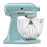 The KitchenAid KSM155GBAZ Artisan Designer series stand mixer, in azure blue, brings innovation and style to your kitchen. The 10 mixing speeds provide flexibility and control whether you are creating a new recipe for cupcakes or your famous herb mashed potatoes. The tilt-back head provides easy access to check on ingredients or change accessories. Use the dough hook for breads, pizza dough and yeast rolls. Whip perfect cream, meringue or icings with the wire whip. From main dishes to dessert, this stand mixer makes your kitchen dreams a reality. With measurement markings on the side in liters and cups, the glass bowl is handy, beautiful and multi-functional. Simply remove the round, metal medallion on the front of the mixer, attach optional accessories (sold separately) to the power hub and you are ready to grind choice meats, prepare fresh applesauce or make delicious, homemade pasta.