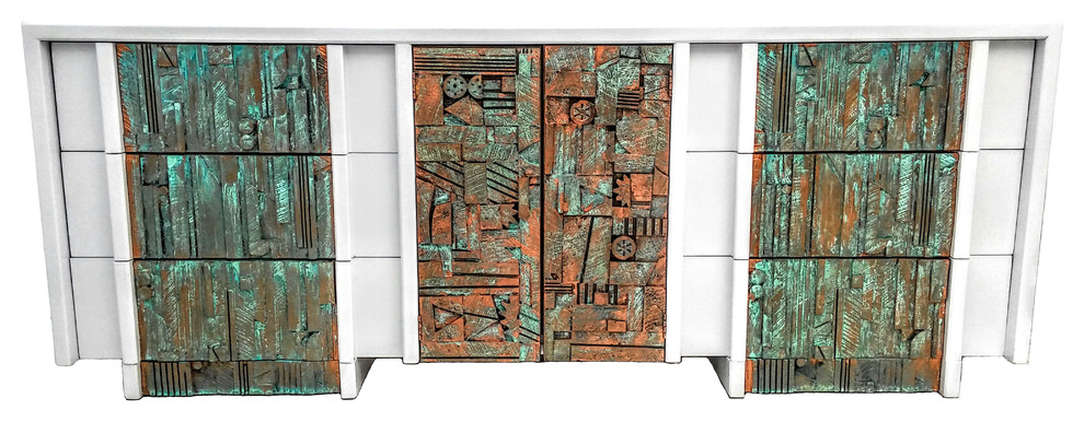 The Consigned Mid-century Modern Lane Brutalist Triple Dresser or Credenza by is a medium tone wood dresser made of quality wooden materials. With a distinctive finish, this is a perfect 9-drawer dresser. The Consigned Mid-century Modern Lane Brutalist Triple Dresser or Credenza is a dresser with a unique rustic look, ideal for adding style and storage to your bedroom. This dresser has a width of 70 to 79 inches, a depth of 16 to 18 inches and a height of 30 to 34 inches. Available on Houzz since August 29, 2016 and sold by Marjet Heitzer, this dresser is currently sold out. To decide if the Consigned Mid-century Modern Lane Brutalist Triple Dresser or Credenza is right for you, check out reviews and 1 questions.